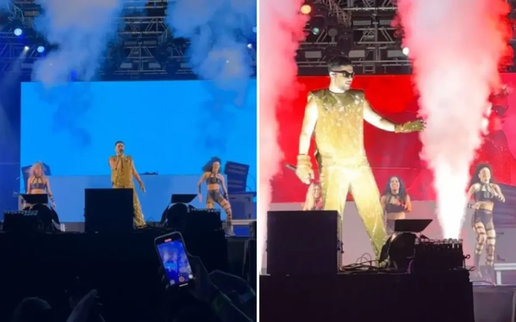 “É a minha segunda vez aqui, sempre fico muito feliz de vir e tô muito feliz, muito ansioso pra subir no palco […]. Cara, [a reação do público] tá sendo surpreendente. Uma música que tá despontando muito é uma música com a Marina Sena, ‘Escada do Prédio’. Essa música tá no top 30 do Brasil e tô feliz que vou cantar ela aqui hoje”.