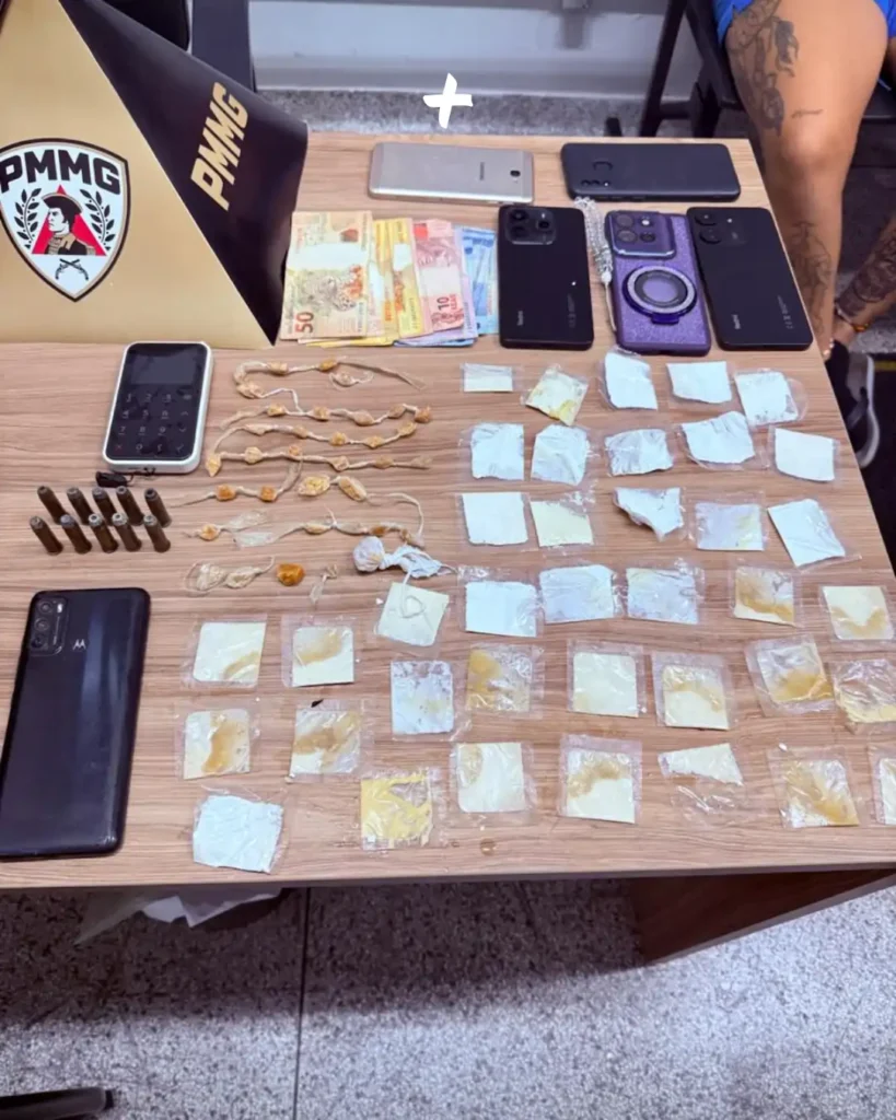 No endereço informado, quatro pessoas foram abordadas, sendo três maiores de idade e um menor. No local, foram apreendidos entorpecentes, dinheiro, aparelhos celulares e munições intactas de calibre .38. Um dos celulares foi reconhecido como pertencente a uma empresa vítima de furto recente na região central. Com o apoio da Polícia Civil, foi realizada uma varredura no imóvel, com o auxílio de um cão farejador, que localizou mais drogas escondidas na rede de esgoto da residência.