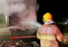 Bombeiros de Extrema combatem incêndio em carreta na BR-381