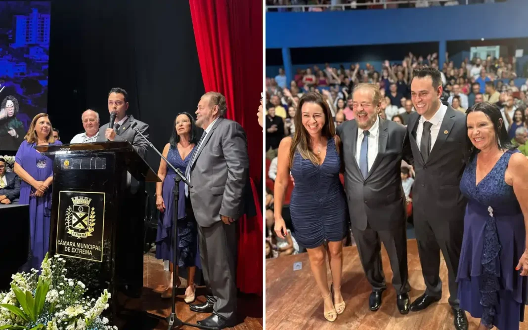 O novo prefeito de Extrema abraçou emocionado sua família no importante evento e também destacou melhorias para o município, pedindo apoio aos vereadores para que a nova gestão consiga realizar as propostas cabíveis à cidade.