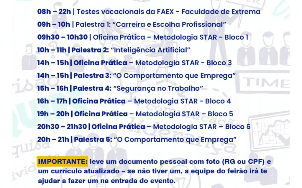 Na segunda-feira, 9 de março, das 8h às 22h, será realizada em Extrema a Feira de Empregabilidade, no Ginásio de Esportes Benedito Egídio, localizado na Rua Dona Olívia, no Centro — mesmo espaço que recebeu a última edição da “Lojinha da Privalia”.