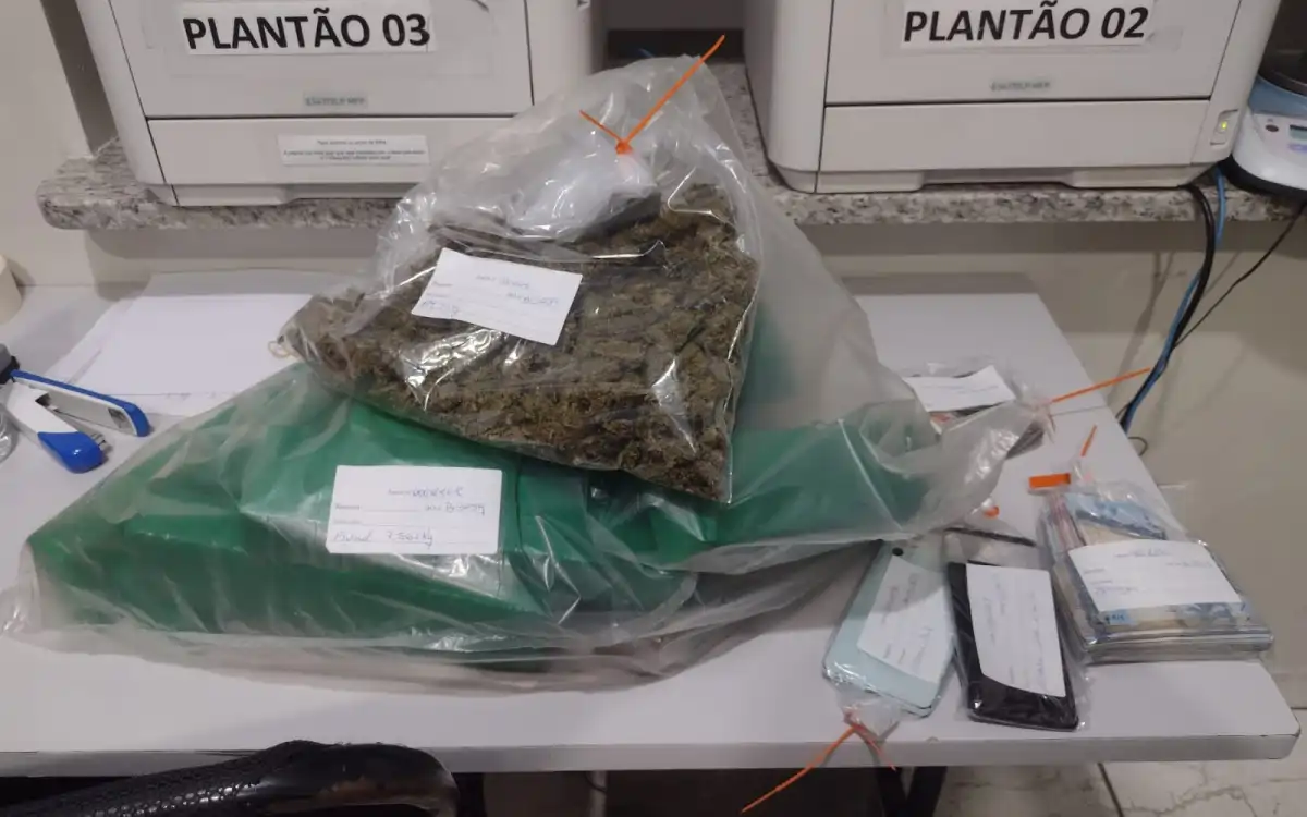No local, foram apreendidos aproximadamente 7,567 quilos de maconha, distribuídos em 13 tijolos, além de 184,37 gramas de maconha e 199,71 gramas de haxixe. Também foram recolhidos R$ 573,00 em dinheiro e dois aparelhos celulares.