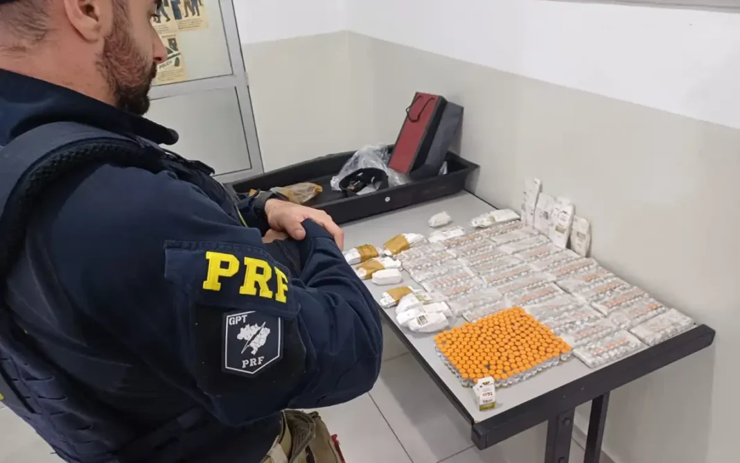 Os policiais perceberam ainda que o condutor apresentava dificuldade de locomoção, o que motivou a realização de busca pessoal. Durante a revista, foram encontradas diversas caixas do medicamento TG-15, de origem paraguaia e recentemente proibido pela Agência Nacional de Vigilância Sanitária (Anvisa), presas ao corpo do suspeito com fitas adesivas, além de 53 ampolas do produto.