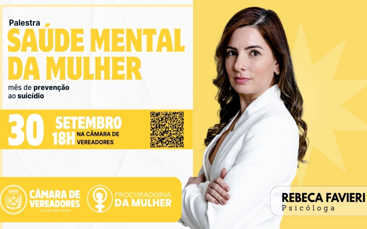 No próximo dia 30, às 18h, a Câmara de Vereadores de Extrema, por meio da Procuradoria da Mulher, apresenta a palestra “Saúde Mental da Mulher: Cuidando de Si Mesma”, com a psicóloga e terapeuta Renata Favieri. O evento encerra o mês da campanha de prevenção ao suícídio ”Setembro Amarelo” e acontece no plenário do Legislativo.