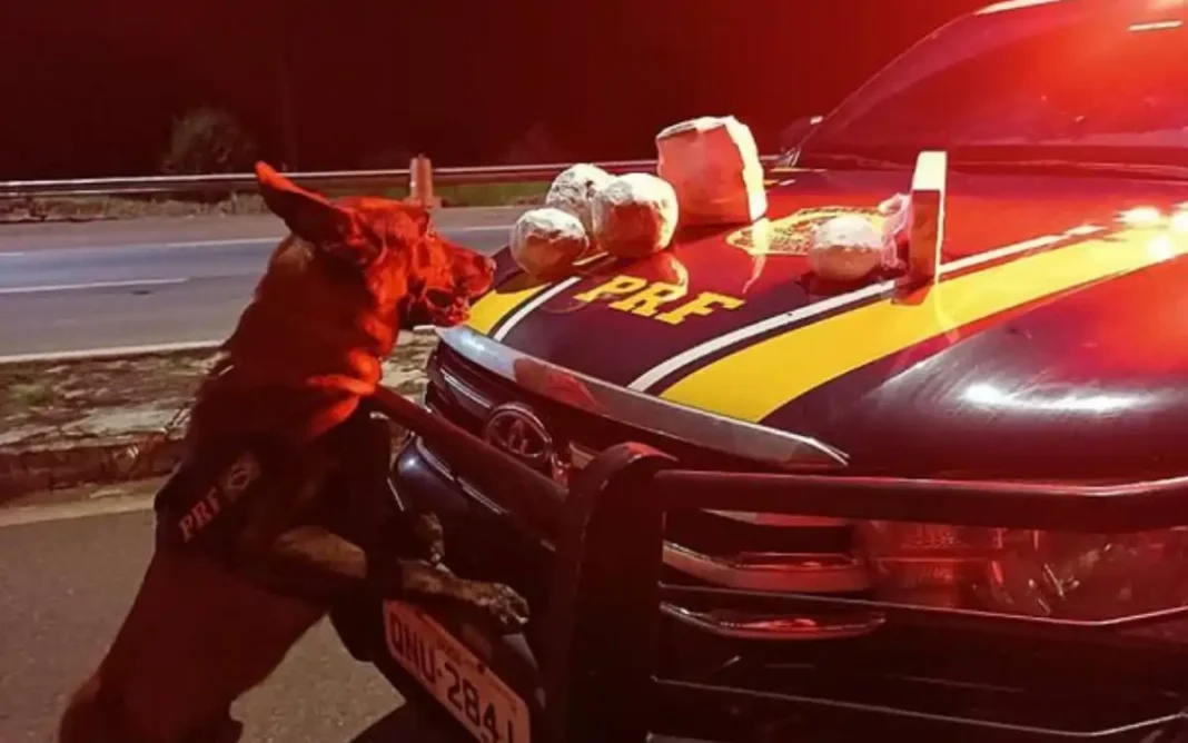 Durante fiscalização no compartimento de bagagens, os policiais encontraram uma mala apontada como suspeita pelos cães farejadores que participavam da ação.